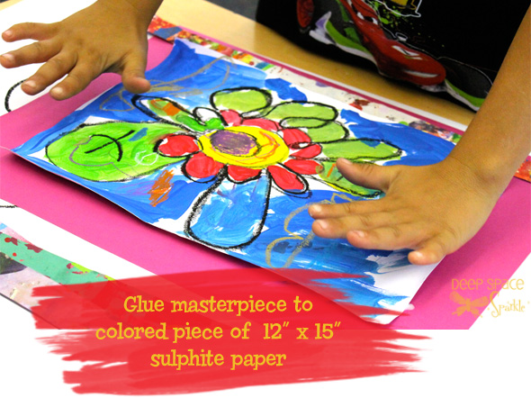 You could stop at the last step and everyone will be quite happy with the experience. However, if you have a bit more time, have the children practice their gluing skills by gluing their artwork onto a sheet of colored sulphite paper. Stress the relative importance of placing the art in the middle of the picture.