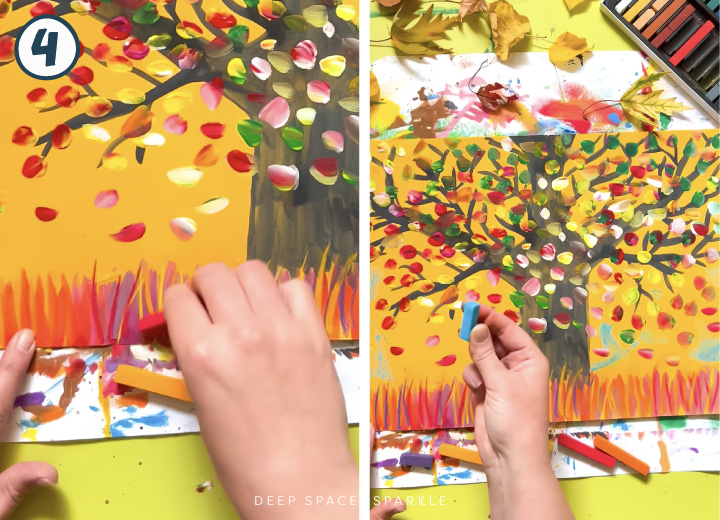 Once the paint is dry, use chalk pastels to add details to the grass and tree trunk.