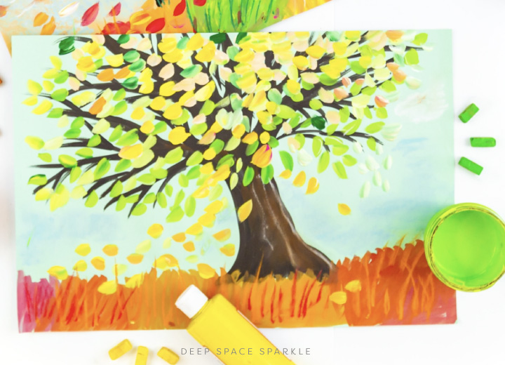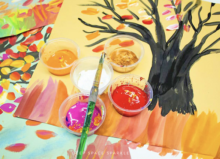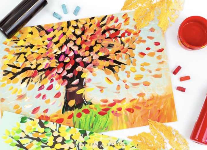 Perfect for classrooms, home school art lessons, or a cozy fall afternoon, or switch the paint colors to red and white for a lovely spring cherry blossom tree version!