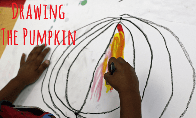 For this lesson, I sat the children down on the carpet and read them a pumpkin book (any one of the hundreds of books on pumpkin patches are fine). We looked at a pumpkin (they just visited a pumpkin patch) and noticed how the pumpkin just isn’t a circle, but a form with many segments (new vocabulary word). I showed them how to draw a segmented pumpkin without drawing a circle or oval. Then, the children sat in their special chair (assigned seat) and held up their oil pastel to show that they were ready to listen.