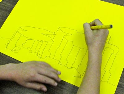 For the final and most important step, outline all original pencil lines with a small brush dipped in black tempera paint. The lines might be hard to see, so paint where colors meet.