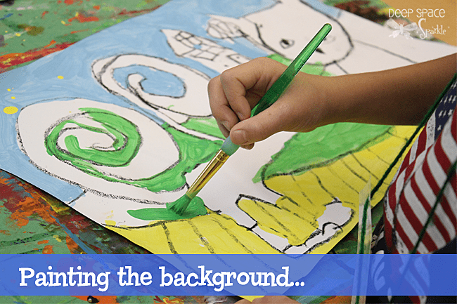 If you get this far on your first day (40-minutes) well done. It was my goal to have children finish the drawing and the background so I could start fresh on Pete the next week. But a better strategy would be to do the drawing and paint Pete on day one and then do the background on day two.
