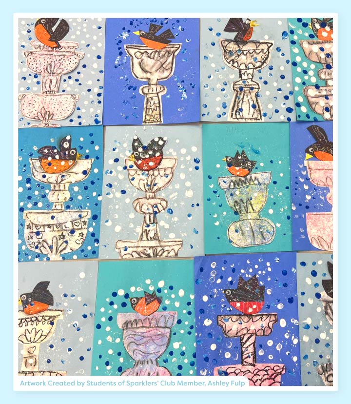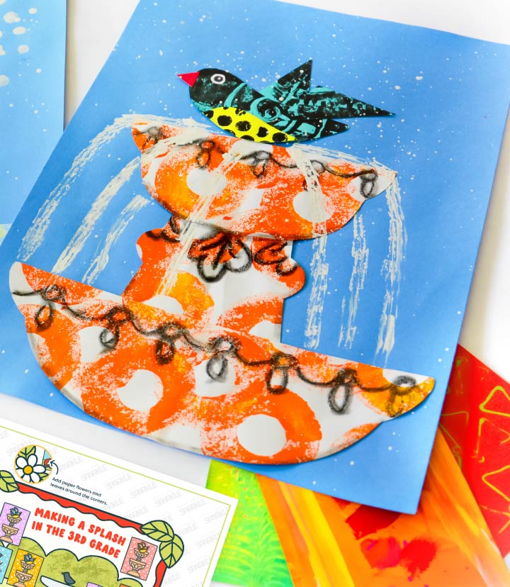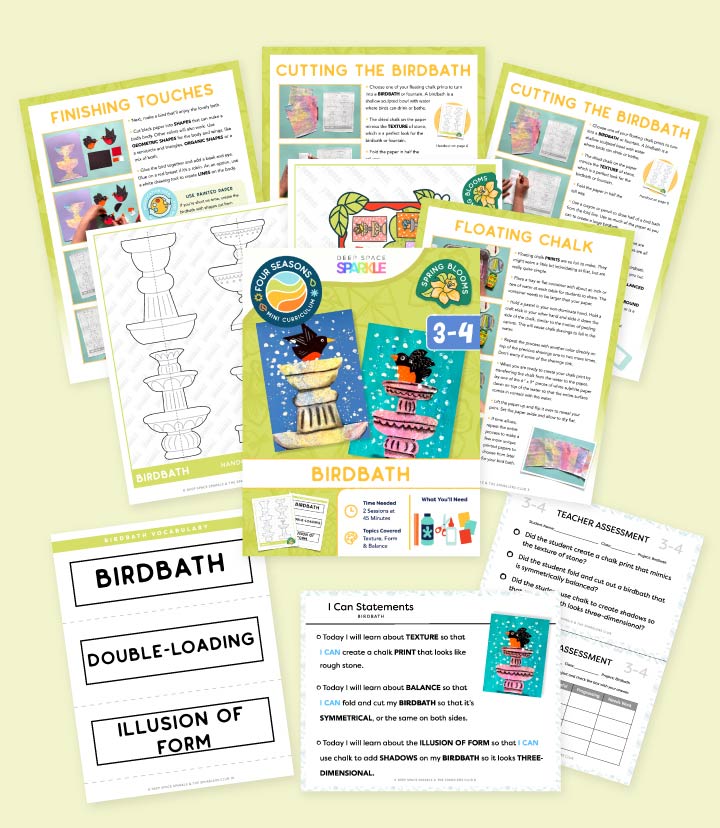 In this richly layered bird bath project, students will create floating chalk prints by shaving soft pastels into water, resulting in beautiful marbled textures.