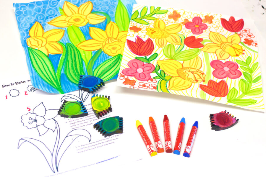 Using a good quality crayon like Faber-Castell wax crayons or oil pastels, draw 2-3 spring daffodils on the painted paper. If a child messes up, encourage her to keep going. The extra crayon marks will add a lovely artistic quality.