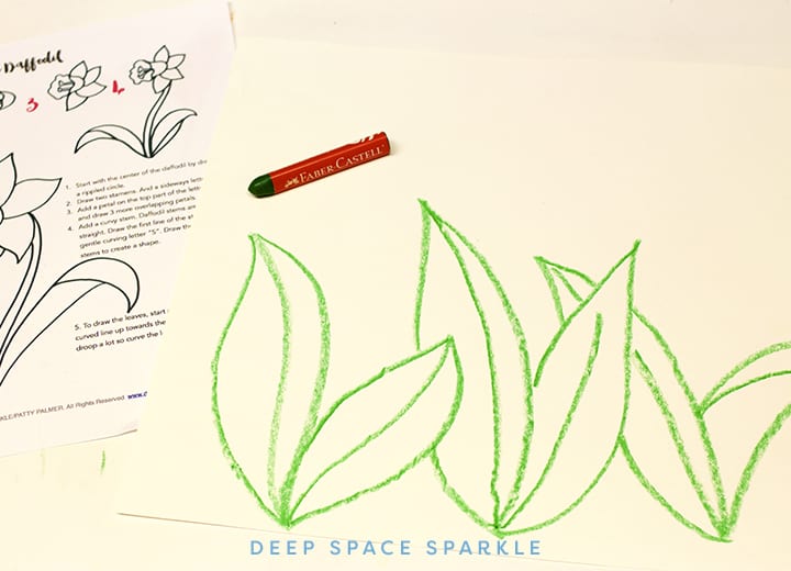 To draw the daffodils, select a crayon color (perhaps a darker color than yellow so the lines are easier to see) and follow the drawing prompts as outlined in the handout.